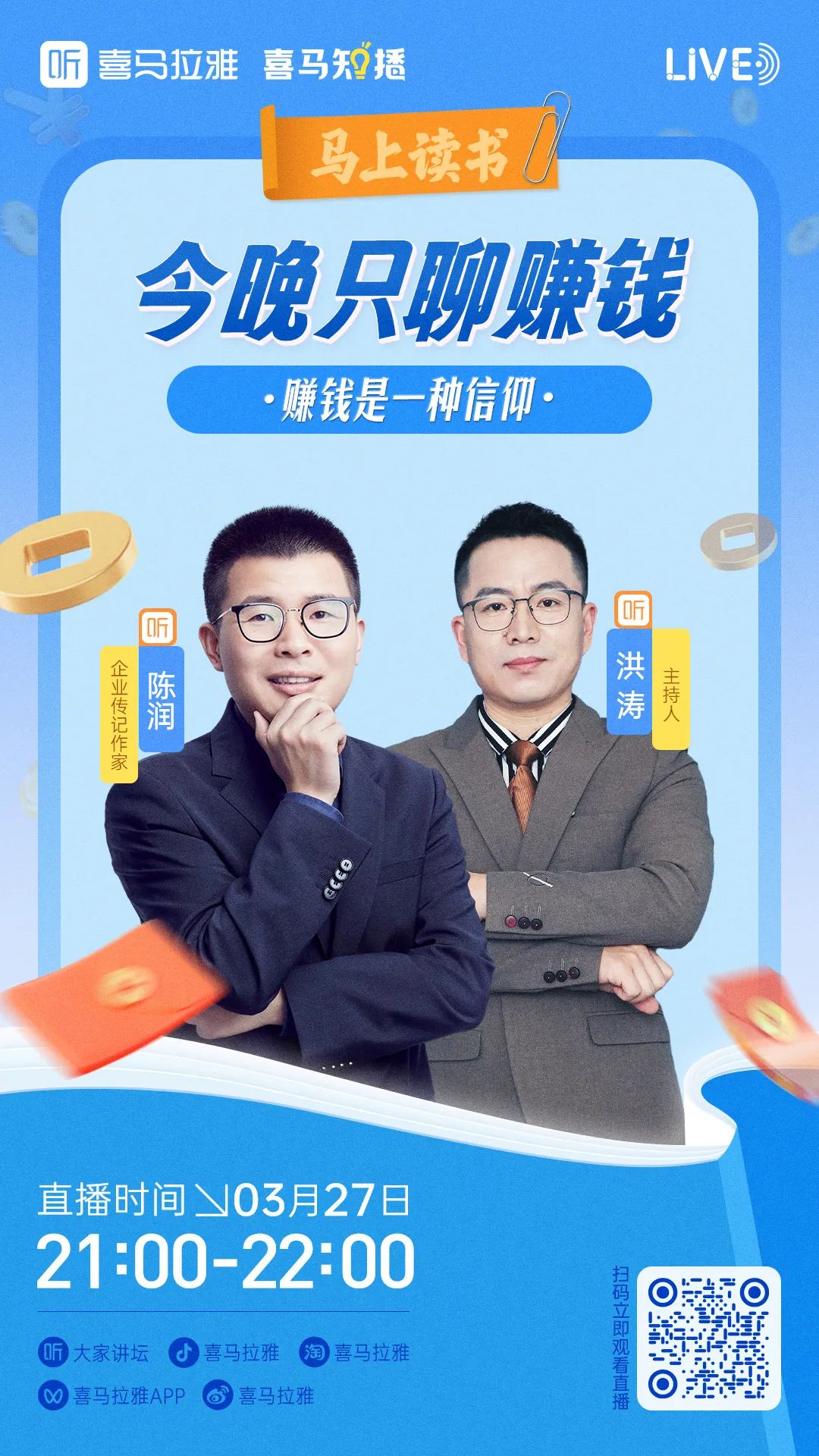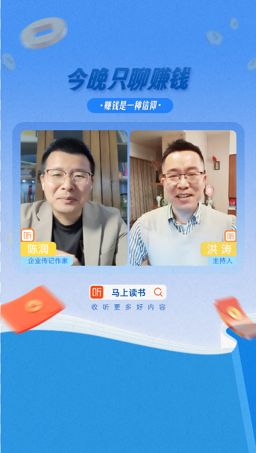 2024年3月27日晚上21:00-22:00,企业传记作家、润商文化创始人兼总裁陈润受喜马拉雅邀请,与喜马拉雅制作人,原中央广播电视台主持人、频道总监刘洪涛直播连线,畅聊赚钱话题,涉及创业、财富、人生,故事精彩,干货满满。
