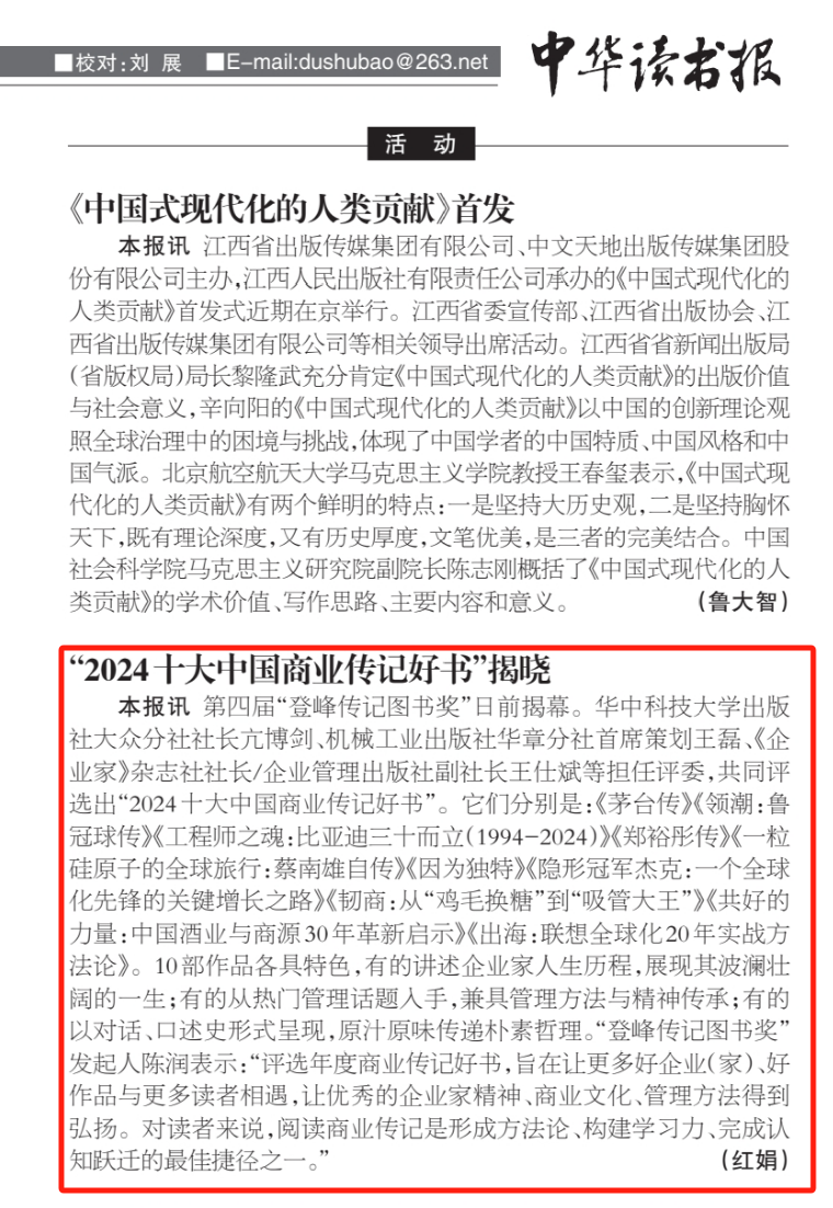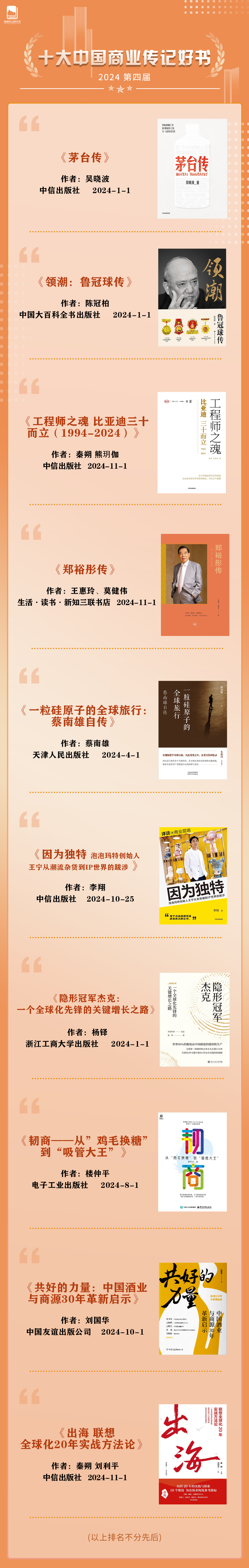 本报讯 第四届“登峰传记图书奖”日前揭幕,华中科技大学出版社大众分社社长亢博剑、机械工业出版社华章分社首席策划王磊、《企业家》杂志社社长/企业管理出版社副社长王仕斌等专家担任评委,共同评选出“2024十大中国商业传记好书”,分别是《茅台传》《领潮:鲁冠球传》《工程师之魂:比亚迪三十而立(1994-2024)》《郑裕彤传》《一粒硅原子的全球旅行:蔡南雄自传》《因为独特》《隐形冠军杰克:一个全球化先锋的关键增长之路》《韧商:从“鸡毛换糖”到“吸管大王”》《共好的力量:中国酒业与商源30年革新启示》《出海:联想全球化20年实战方法论》。10部上榜作品各具特色,有的讲述企业家人生历程,展现波澜壮阔的一生;有的从热门管理话题入手,兼具管理方法与精神传承;有的以对话、口述史形式呈现,原汁原味传递朴素哲理。“登峰传记图书奖”发起人陈润表示:“评选年度商业传记好书,旨在让更多好企业(家)、好作品与更多读者相遇,让优秀的企业家精神、商业文化、管理方法得到弘扬。对读者来说,阅读商业传记是形成方法论、构建学习力、完成认知跃迁的最佳捷径之一。”(红娟)